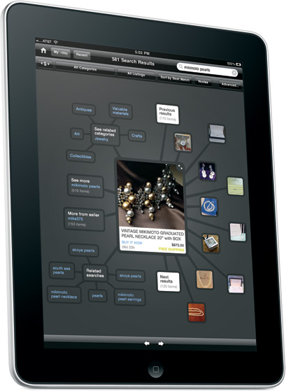 SpicyNodes is a great way to browse all kinds of things, including online marketplaces. The following is a prototype from our labs of how SpicyNodes could be used on an iPad to browse an online auction service.\n\n